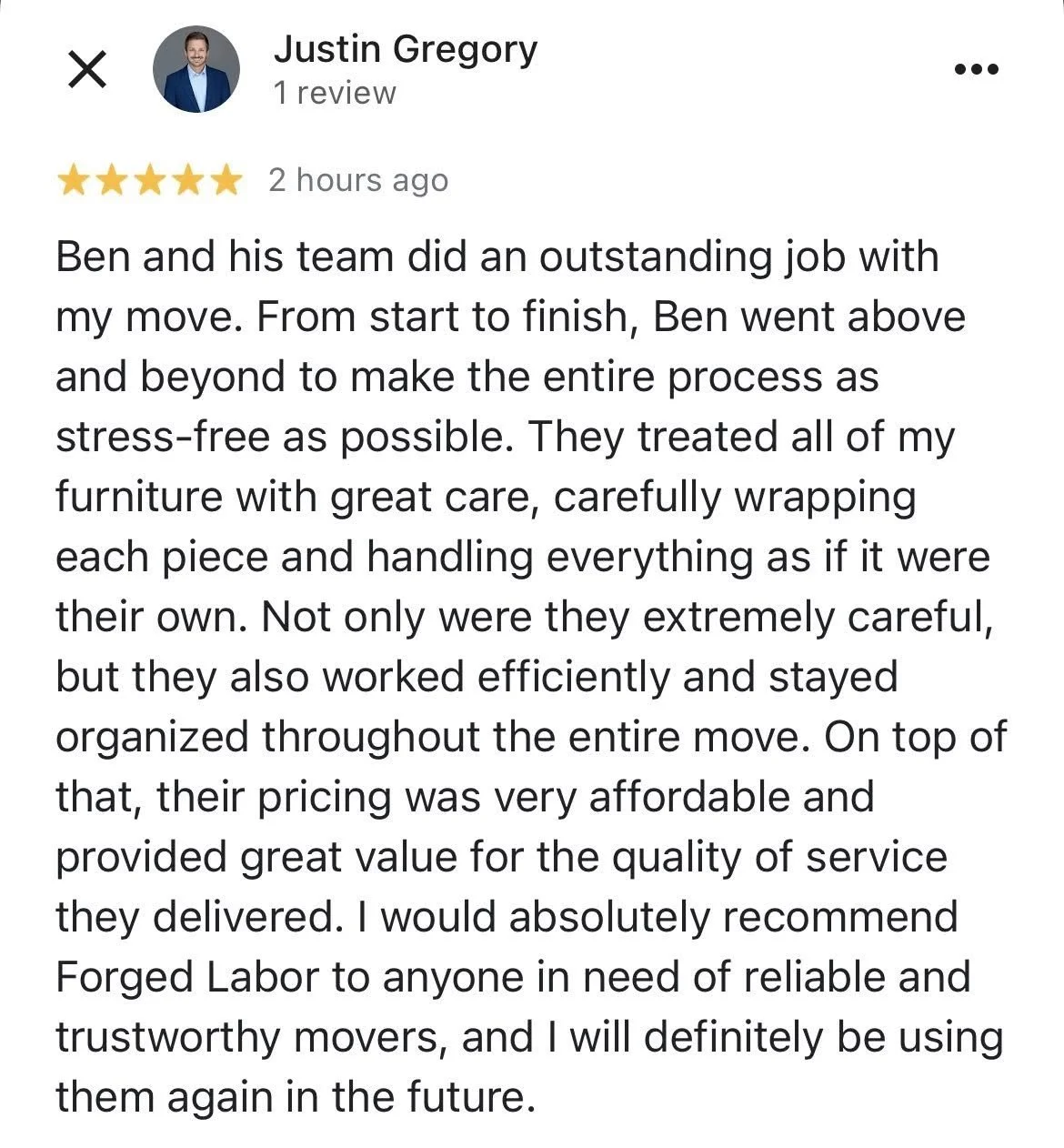 When you hire FORGED LABOR, you’re hiring a high-performing team of insured professional movers who efficiently handle every part of your move from loading to transport to unloading with dialed-in precision and care.