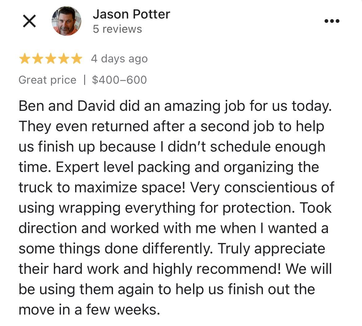 We show up on time and ready to work hard. We properly protect your belongings then pack them neatly in the truck to minimize shift - preventing damage during transit. We carefully unload at your new destination, then we’re happy to help with any furniture arrangement or assembly. When we’re finished and you’re satisfied, we’ll present your invoice with no hidden fees or surprise charges.